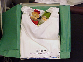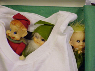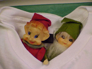| Ahh, those evil elves. They seem to show up just about anywhere. Why here they are nestled in a shirt that Lisa sent her brother Douglas. The elves had been living in Sterling, Virginia since Christmas of 1999. I guess they wanted to visit the City of Brotherly Love--Philadelphia. But I only see two elves, where's the third?....Hmmm, let's take a closer look. | ![]() |